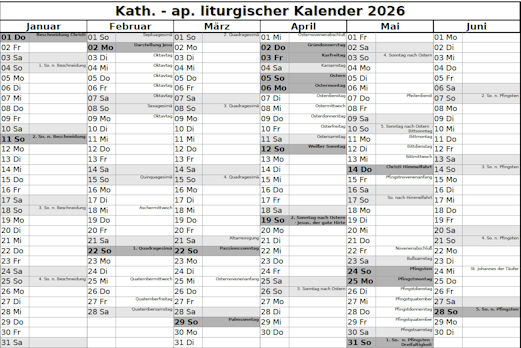 Wie an einigen unserer WEB-Sites, kann auch an unserem Portal die Kalenderausgabe für die Liturgie 2026 heruntergeladen werden. Dazu klicken Sie am Rechner oder tippen sie an einem Tablet-PC auf das Kleinbild der rechten Spalte.